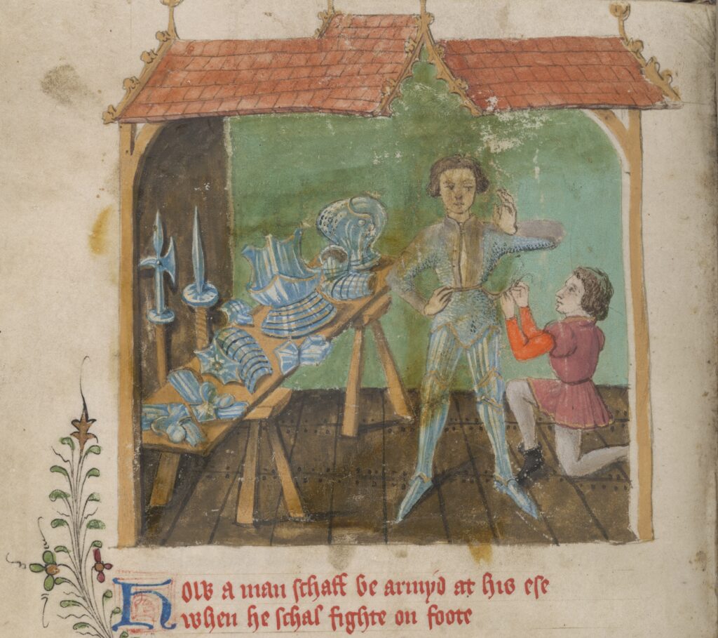 | fols. 122v-123v | How a man schall be armyd at his ese when he schal fighte on foote | Essay on this is here. |