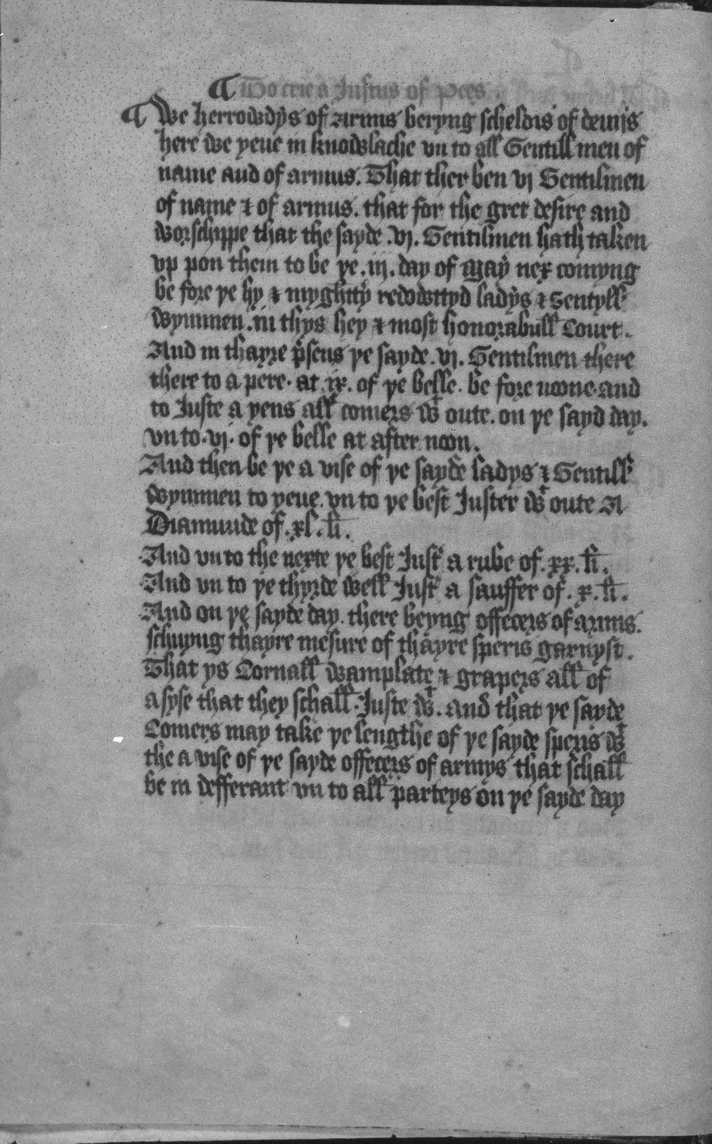 Black and white image of M775 folio 3 verso, "Abilment for a Joust of the Peace" ca 1450, Middle English